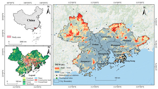 The GBA (21°25′N~24°30′N, 111°12′E~115°35′E), also known as the PRD urban agglomeration, includes two Special Administrative Regions, namely Hong Kong and Macao, as well as nine cities in the PRD, namely, Guangzhou, Shenzhen, Zhuhai, Foshan, Dongguan, Zhongshan, Jiangmen, Zhaoqing, and Huizhou. The GBA is located in Southern China’s coastal area, downstream of the Pearl River and bordering the South China Sea (Figure 1), and it covers an area of 56,000 km2. The central part of the GBA contains plains, while the western, northern, and eastern parts are surrounded by hills. The GBA has a subtropical monsoon climate with an average annual temperature of 22.5 °C and total annual rainfall within the range of 1500–2500 mm. Over the past 40 years, climate change in the GBA was mainly characterized by average annual temperature increases, an increase in extreme precipitation, and a decrease in average annual sunshine hours [32,33]. Regional climate change presents enormous challenges to environmental quality. By the end of 2020, the population of the GBA was greater than 86 million, and its GDP exceeded 11 trillion yuan. Forests and croplands comprise the dominant vegetation types, and agriculture and aquaculture are well developed. The GBA now has become an important base for China to build a world-class city cluster with high-quality development, playing a strategic role in the development of the whole nation.