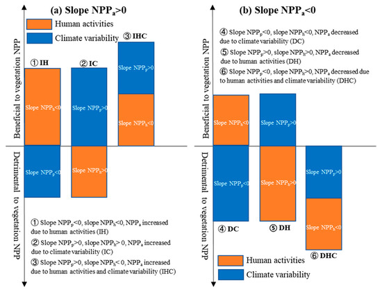 Identification of the relative impacts of climate variability and human activities on the NPPa according to the slopes of the NPPa, NPPp, and NPPh. Six scenarios are represented in (a) slope NPPa > 0 and (b) slope NPPa < 0.