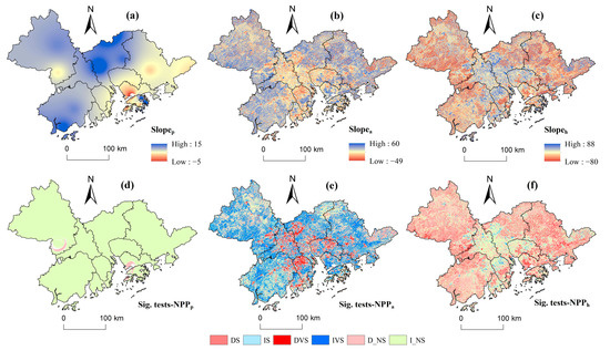 Trends in annual (a) NPPp, (b) NPPa, and (c) NPPh from 2000 to 2020, and slope significance tests for (d) NPPp, (e) NPPa, and (f) NPPh in the study area. DS, decreased significantly (0.01< p ≤ 0.05); IS, increased significantly (0.01 < p ≤ 0.05); DVS, decreased very significantly (p ≤ 0.01); IVS, increased very significantly (p ≤ 0.01); D_NS, decreased or non-significantly (p > 0.05); I_NS, increased non-significantly (p > 0.05).