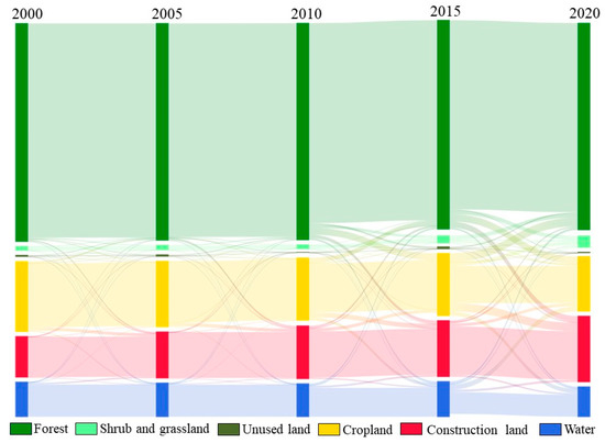 Sankey diagram for conversion between different land cover types in the GBA from 2000 to 2020. Note that different color lines represent the direction of land type transfer, and the width of the line represents the area transferred.