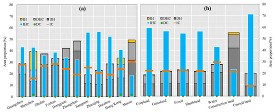 The area of NPPa changes due to different driving forces in the 11 cities (a) and land cover types (b) from 2000 to 2020. Definitions of the driving forces are given in Figure 2.