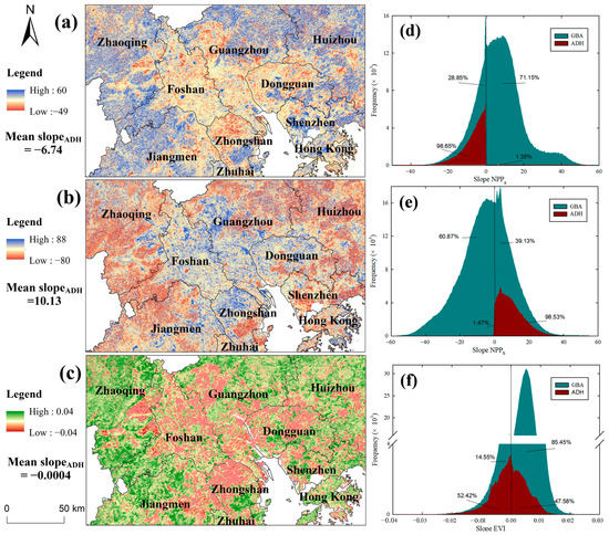 Previous studies have revealed that temperature, precipitation, and solar radiation are the three dominant climate-related factors affecting vegetation dynamics [60,61]. To better understand the relationship between the NPPa and these three climatic factors, a partial correlation analysis was used and the results are shown in Figure 6. The results showed that the NPPa was overall positively correlated with temperature and solar radiation (with partial correlation coefficients of 0.0339 and 0.0264, respectively; Figure 6a,b), but negatively correlated with precipitation (with a partial correlation coefficient of −0.1491; Figure 6c). Pixels that had positive correlations between temperature and the NPPa accounted for 52.45% of the total pixels (Figure 6d) and mostly occurred in the southern and northeast GBA (Figure 6a). A negative sensitivity to temperature was mostly found in the northwest and central GBA. A positive response of the NPPa to solar radiation was found in most of the southwest and central GBA (Figure 6b), accounting for 50.51% of the total pixels (Figure 6f), while negative correlations mostly occurred in the northwest and northeast GBA. Regarding precipitation sensitivities, about 79.87% of the total pixels had negative coefficients related to the NPPa, and they were mainly distributed in the southwest, southeast, and central GBA (Figure 6b,e).