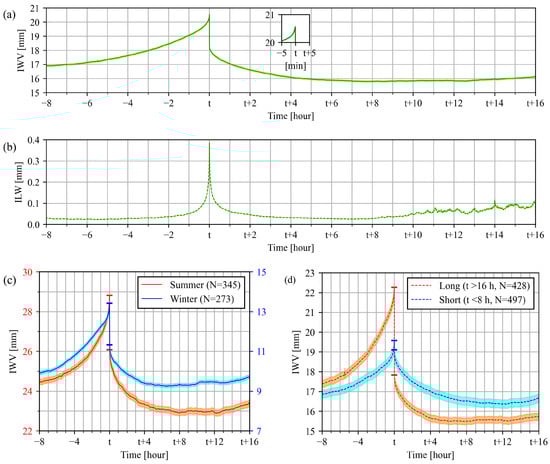 Composites of (a) integrated water vapor (IWV, green solid line) and (b) integrated liquid water (ILW, green dashed line) 8 h before and 16 h after rain, (c) the IWV composites in summer (N = 345) and winter (N = 273), as well as (d) the IWV composites for long (N = 428)- and short (N = 497)-duration rain events. The subplot is from 5 min before rain to 5 min after rain. IWV and ILW acquired by the TROpospheric WAter RAdiometer (TROWARA) in Bern. The shaded area shows the standard deviation of the mean (error of the mean ). Time t is the duration of rainfall. Short horizontal lines mark the beginning and end of rainfall.