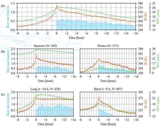 Composites of (a) IWV (green solid line), T (red solid line), rain rate (blue area) 8 h before and 16 h during rain, considering the rain events (b) in summer and winter, as well as (c) with long and short duration.