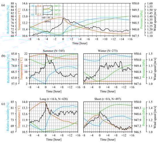 Composites of (a) temperature (red solid line), pressure (green solid line), relative humidity (blue solid line), and wind speed (black solid line) 8 h before and 16 h during rain, considering the rain events (b) in summer and winter, as well as (c) with long and short duration. Subplot (a) is from 60 min before rain to the onset of rain.