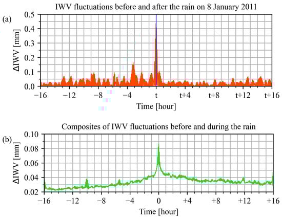 (a) IWV fluctuation series 16 h before and after a rain event between 02:11 UT and 07:05 UT on 8 January 2011 (red). The blue vertical line represent the occurrence/duration time of rain. (b) Composite of IWV fluctuation series of 759 rain events 16 h before and during rain (green).