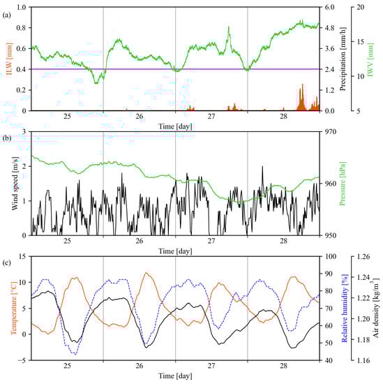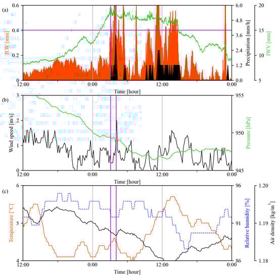 Diurnal variations of atmospheric parameters do not cause the main effect and domination during the rain period. Figure 8a shows the diurnal variation of IWV during the long clear sky period from 25–28 January. Hocke et al. [] described that the diurnal cycle of IWV over Bern ranges from 0.5 mm below the daily average in the morning to 0.5 mm above the daily average in the evening. Because this change is less than 5%, it can be assumed that the diurnal cycle of IWV has no direct effect on its changes during the rain period. For example, there are two light rain events lasting 1 to 2 min at 22:58:01 UT on 2 January and at 5:07:11 UT on 3 January, and a rain event lasting three days from 5:20:07 UT on 10 January to 22:55:19 UT on 12 January. During these rain events, the changes in IWV are consistent with the description in the previous subsection. As shown in Figure 8b,c, the wind speed and pressure have no obvious diurnal cycle during the clear sky period (with ILW = 0 mm), but temperature, relative humidity, and air density do. The temperature is highest around 14 UT, while the relative humidity and air density are lowest. The strong diurnal cycle of temperature during the clear sky period might be due to the absence of cloud droplets and to the diurnal variation of the greenhouse gas water vapor. Because only 22.6% of all 1199 rain events in this study occur in the afternoon from 14 to 17 UT, it can be assumed that the diurnal cycle of these parameters has no strong effect on them as precursors of rainfall.
