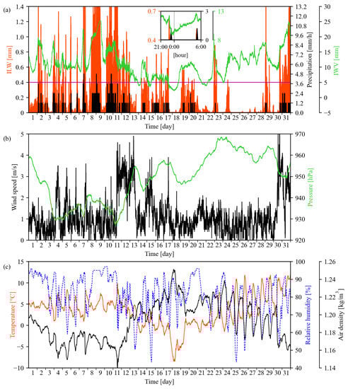 Time series of TROWARA and meteorological data from 1–31 January 2016. (a) Time series of IWV (green solid line), ILW (red area), and the precipitation (black area). The purple horizontal line is ILW = 0.4 mm. The subplot is from 21:00 UT on 2 January to 6:00 UT on 3 January. (b) Time series of surface pressure (green solid line) and wind speed (black solid line). (c) Time series of surface temperature (red solid line), relative humidity (blue dashed line), and air density (black solid line).