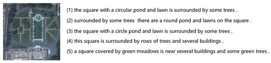 In remote sensing images, the scale, distribution, and number of objects often vary [6]. To further illustrate the difficulties in remote sensing image captioning, we chose an example in the RSICD data set, as shown in Figure 1. Variously sized objects with scattered distribution can be observed. If the bounding boxes of Faster-R-CNN [15] (Faster region convolutional neural networks) are used to represent the object features, they will overlap each other to a large extent and will contain a great deal of background noise. In this situation, most researchers can only use the output of a pre-trained CNN (e.g., ResNet [16], VGG [17], and so on) to extract image features, which may result in a loss of region features. In addition, it can be found in the descriptions that high-level semantic words, such as “square”, are necessary to describe the image content. If only utilizing the image region or object features, we can only obtain low-level semantic words, such as “pond”, “trees”, and “buildings”. It can be shown that high-level semantic words mainly rely on the global relationships among objects, but not local image features. Such global relations can be interpreted as global semantic information. In most CNN-based methods, the mean pooling operation is applied to capture the global semantic information, but this may lead to neglecting the relationships between objects and scenes, causing key information loss and influencing the high-level semantic words; therefore, CNN using mean pooling are inadequate when it comes to capturing the global semantic information required for remote sensing image captioning.