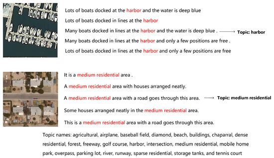 As topics are based on the large-scale scene and the whole caption, it is difficult to directly train the topic token with image captioning data sets. Hence, in order to train the whole network faster and better, a remote sensing topic classification task is used to pre-train the encoder and the topic token. The first part involves setting topic labels, where annotators provide a class name set for the whole data set for further usage. In this sense, RSICD [27] provides 30 category names, UCM [6] provides 21 names, and Sydney [6] provides 7 names (e.g., airport, parking lot, dense residential area). In the RSICD data set, there is a category name corresponding to each image, which we directly set as the topic label. For the UCM and Sydney data sets, we use the following strategy to find the topic label corresponding to the image: if a class name appears in more than three captions of an image, it is set as the topic label of the image. An example of this strategy is shown in Figure 5. In this way, a remote sensing topic classification data set was built. In the pre-training classification task, to ensure that the topic token can extract the global semantic information, only the output feature of the topic token is used as input to the classification layer. Then, the pre-trained weights are used to initialize the encoder and topic token.