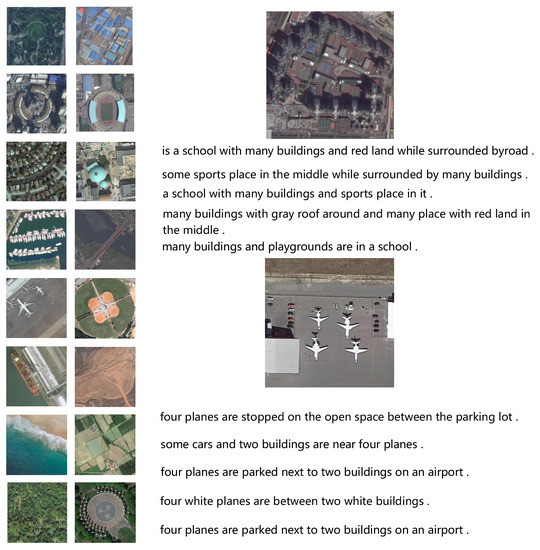 - The RSICD data set [27] contains 10,921 images in 30 categories, where the size of each image is 224 × 224 pixels. Compared with other data sets, RSICD has a larger number of images and richer descriptions.Each image in these three data sets has five corresponding human-annotated descriptions.