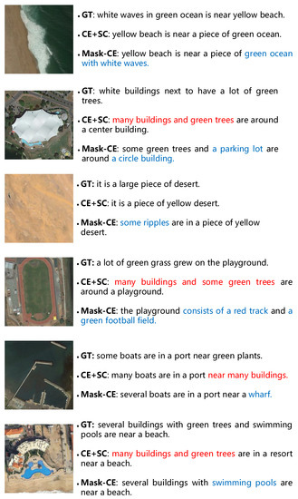In addition, a new training strategy to improve the diversity of generated sentences is proposed, named Mask–Cross-Entropy (Mask-CE). With the Mask-CE strategy, some words in the sequence are randomly masked in each training iteration, and the next word is predicted based on fewer ground-truth words, which effectively suppresses the exposure bias and enhances the robustness of the method. Furthermore, the random mask operation can boost the diversity of the training sequence context, which is useful for preventing over-fitting and enhancing the learning ability. Experiments on three remote sensing data sets show that this training strategy can outperform the evaluation metric score of CE with SC while maintaining diversity at the same time.