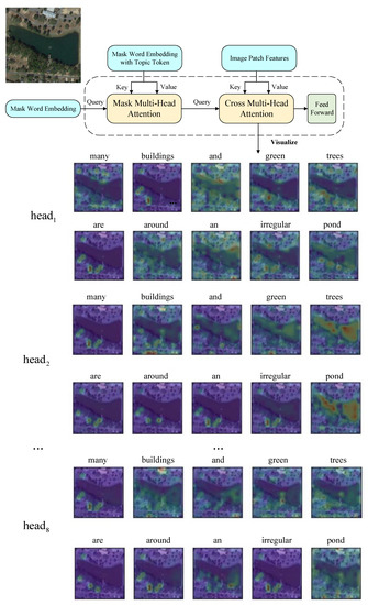 The semantic-guided decoder is mainly composed of two multi-head attention blocks. Section 3.1 showed that using only local patch features cannot represent the global semantic information in remote sensing images. To generate better captions, we designed the semantic-guided attention and cross-attention modules. The two parts of the output in the encoder (in Equation (3)) are used in the two attention modules, respectively. The semantic-guided decoder generates the next word token, based on the two parts above and the pre-predicted words.
