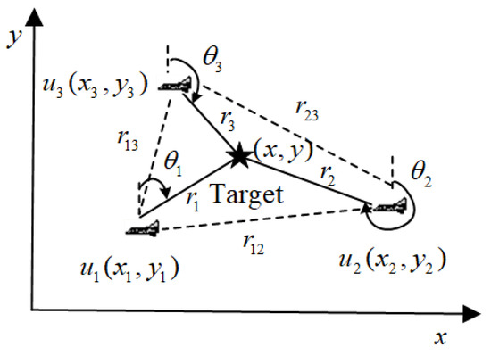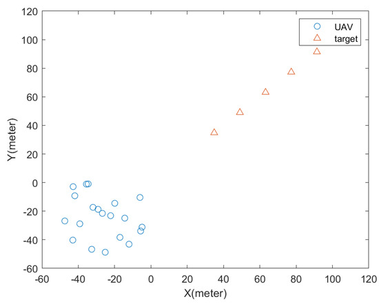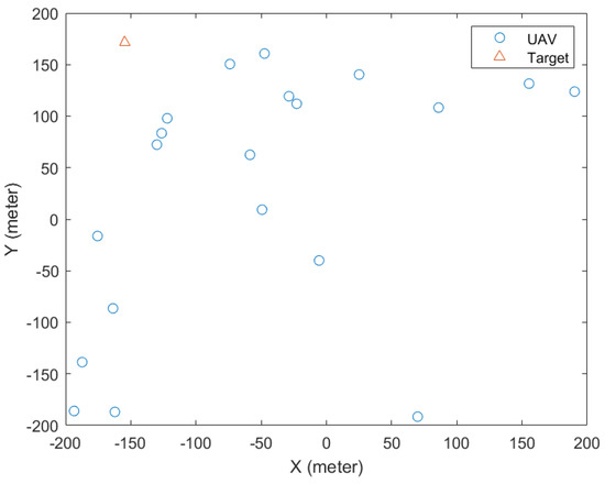 The simulation scenario is shown in Figure 5. The true target location is placed at (−155,175) m. 20 UAVs are randomly distributed in an area of 200 m × 200 m. The range of bearing noise standard deviation is set from to , corresponding to 0.0175 to 0.1396 rad.