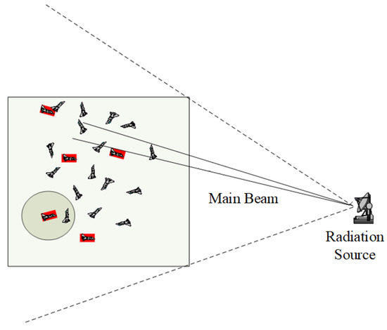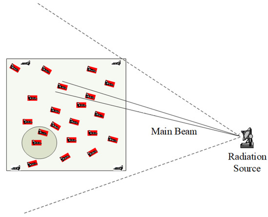 The initial distribution of multiple UAVs are dispersed as illustrated in Figure 2, and each UAV is independently reconnoitering. If a UAV finds the radiation source signal, it will send the bearing information to the UAV within the communication radius. After receiving the radiation source bearing information, the UAVs in the neighborhood adjust their reconnaissance direction.