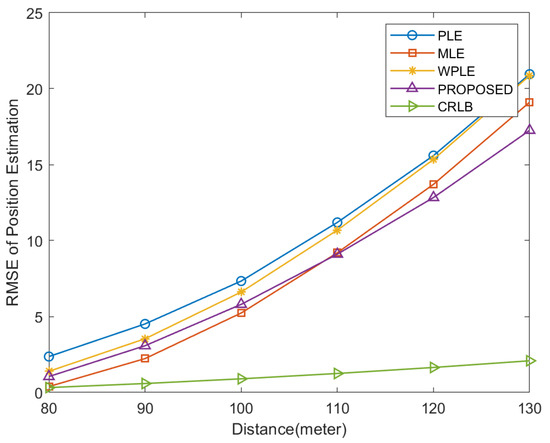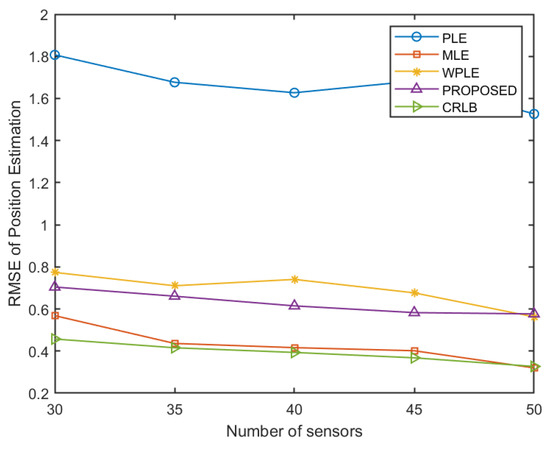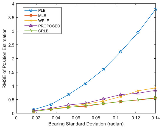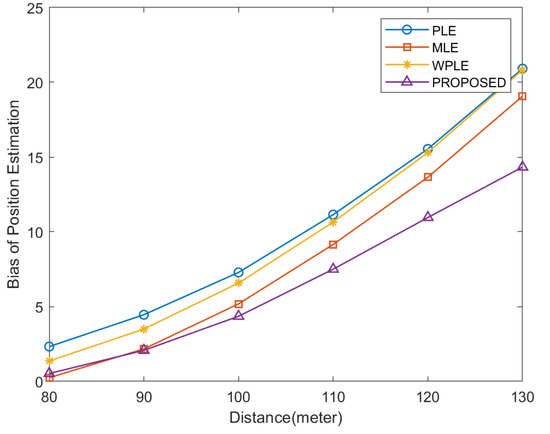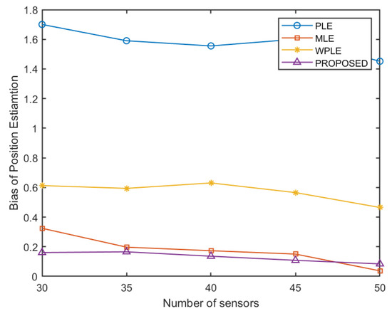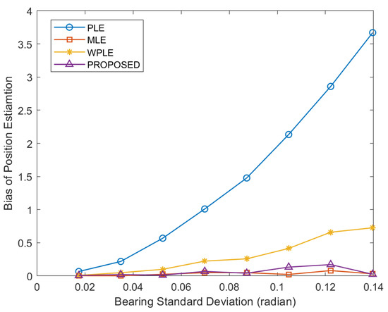 The RMSEs of the position estimate as a function of the number of UAVs ranging from 30 to 50 are shown in Figure 8. The bearing noise standard deviation and the UAV’s communication radius are set to rad and 60 m, respectively. It can be seen that the performance of the proposed method is better than the PLE and the WPLE. The performance of the MLE method is closed to the CRLB. The bias of the PLE, WPLE, and MLE are compared with the proposed method in Figure 9. The proposed method produces smaller bias than that of the PLE, WPLE, and MLE over the measurement noise examined.