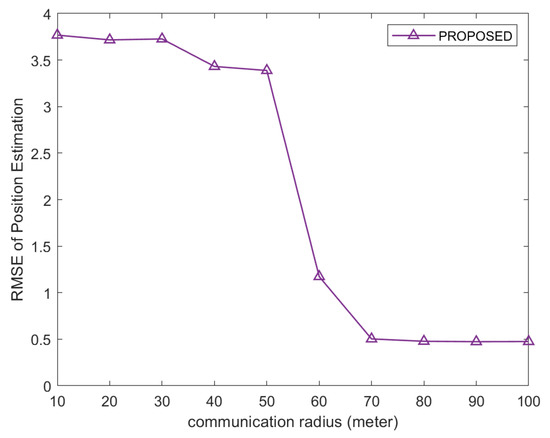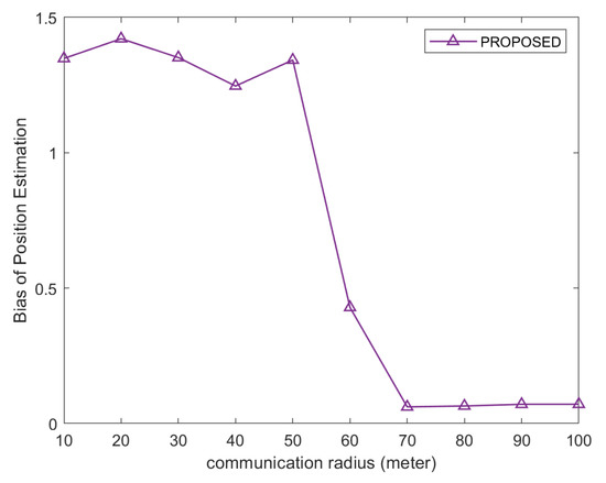 Figure 10 and Figure 11 illustrate the RMSE and bias results for the UAV’s communication radius ranging from 10 m to 100 m, respectively. The bearing noise standard deviation is set to rad. As expected, with the increase of the communication radius of the UAVs, more UAVs are weighted in the pheromone transmission mechanism; therefore, the RMSE and bias of the proposed method gradually decrease.