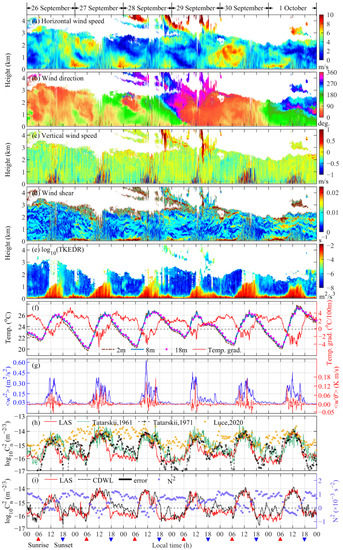 As shown in Figure 2, six days of continuous observations were carried out from 00:00 on 26 September to 24:00 on 1 October 2020, local time. Figure 2a–e represent wind field and TKEDR results obtained from the CDWL, Figure 2f is the temperature data recorded at the height of 2 m, 8 m, and 18 m of the wind tower and the temperature gradient result calculated by linear fitting. Figure 2g shows the variances of vertical wind component fluctuation and the heat flux of potential temperature. The results of log10 that are estimated by different methods introduced in the principle part are drawn in Figure 2h. Since the height of the wind tower is about 18 m and near the ground, which represents the changes in a local area of the surface, the calculated temperature gradient can vary widely every day. In addition, the method used to estimate is suitable for stable conditions. Therefore, to reduce errors, in the process of calculating in the horizontal experiment, the temperature gradient is taken as the empirical value in the troposphere: −0.0065 K/m; the pressure gradient is −0.10 hPa/m.