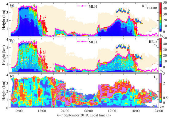 From the results of Lv in Figure 3a, one can observe that it is bigger than Δy, Δz, and lΔy in most cases, which means that TKEDR and are measured and retrieved within the inertial subrange most of the time during the experiment. During the transition period around 16:00–20:00, the integral scale of turbulence Lv drops to the scale smaller than Δz. Similarly to the results shown in the temperature gradient and N2, this verified the prominent motion state of atmosphere changes from convective to laminar flow and the sensing volume exceeding the integral scale of turbulence. Thus, the spatial resolution of CDWL Δz needs to be improved in near-surface observations in future studies. In addition, the results also indicate that it is reliable to use the criterion in measuring the credibility of the new method.