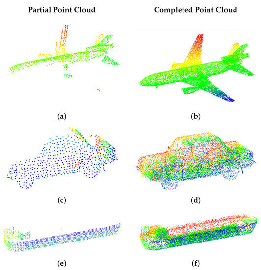 Examples of point clouds from the PCN dataset colored by height. The incomplete point cloud inputs are shown on the left, and the corresponding completed point clouds are shown on the right. (a) N = 2048, (b) N = 16384, (c) N = 2048, (d) N = 16384, (e) N = 2048, (f) N = 16384.