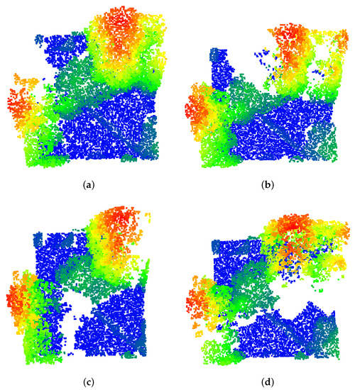 A single scene from DALES Viewpoints Version 2, colored by height, with occlusions from multiple flight patterns. (a) Northwest to Southwest, (b) Southwest to Southeast, (c) Southeast to Northwest, (d) Northeast to Northwest.