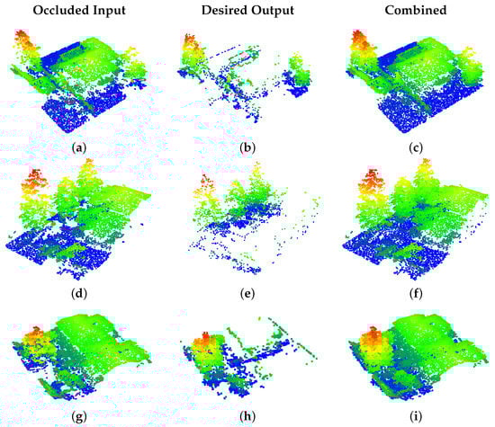 Examples of corresponding scenes from the DALES Viewpoints 2 data set, colored by height. The occluded input is in the left-hand column, the desired output is in the middle, and the combined full point cloud is on the right.