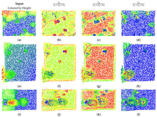 Visual example local eigenvalues representing different spatial properties on the DALES Viewpoints Version 2 dataset. The original input point cloud is colored by height. The Eigen feature representations are colored by value, with warm tones indicating high values and cool tones indicating low values.