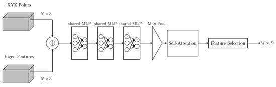 We extract the eigenvalues and concatenate them with our point set to form our initial features of size . The first three dimensions are the X, Y, and Z, and the final three are the eigenvalues of size for each point. We then run this set of features through a series of shared multilayer perceptrons of size , with the final output layer being the same size as the number of points that we wish to downsample to, in this case, size M. The output of the shared multilayer perceptrons are local features for each point, of size . We then integrate a self-attention module that helps establish relationships between each point feature. For each point , we want to establish an attention score, for .