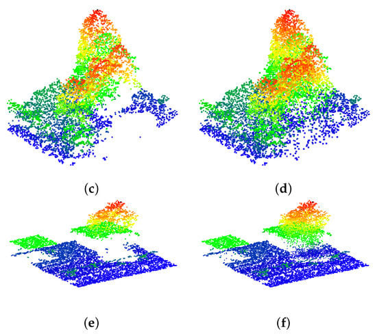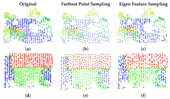 Visual comparison of farthest point sampling and our proposed Eigen feature sampling. Each point cloud is colored by height. The original input point cloud is shown in the right-hand column at the actual resolution of 2048 points. The center column shows downsampling to 1024 points using farthest point sampling. The right-hand column shows our Eigen feature sampling, also at 1024. (a) N = 2048, (b) N = 1024, (c) N = 1024, (d) N = 2048, (e) N = 1024, (f) N = 1024.
