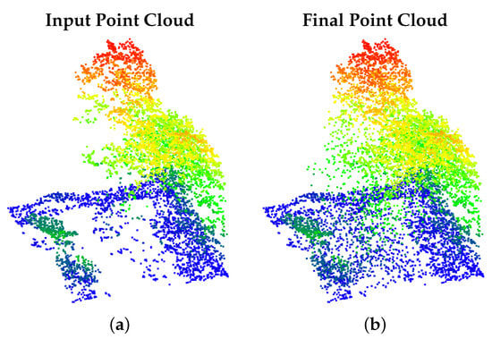 Occlusions present a significant challenge when analyzing and interpreting these data. Studies have shown that the presence of occlusions result in loss of accuracy of any additional algorithmic steps and is a distracting artifact when presenting the scene to an observer or analyst [,]. Current methods to prevent or reduce occlusions focus mainly on data collection instead of post-processing. Taking multiple viewpoints or stitching overlapping point clouds are common and effective ways to reduce occlusions. However, these data collection-based methods have downsides; increased flight time can quickly increase the cost of the collection, especially for aerial lidar applications.