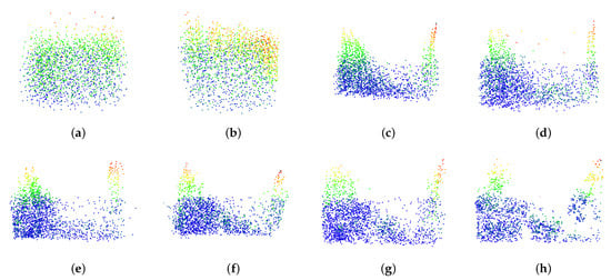 The most commonly used hierarchical sampling technique is farthest point sampling (FPS) [,,,]. In this method, the first point is chosen arbitrarily. The next point chosen is the farthest point from the initially selected point. Points are chosen continuously, each time selecting the new point to be the point that is as far away as possible from the set of previously selected points. This method is robust to differences in resolution within the scene. For example, one area may have a dense resolution, while another area has a sparse resolution. When randomly sampling, it is common to miss key points in the sparsely populated area; however, FPS mitigates this issue by getting spatially diverse points.