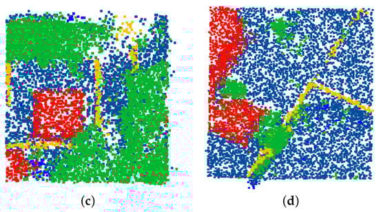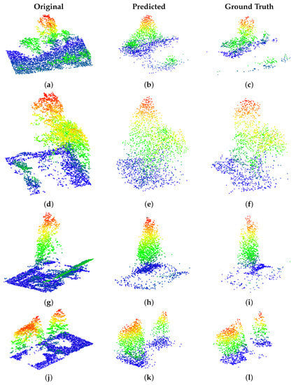 Table 5 shows the semantic segmentation’s overall results. We use the PointNet++ architecture to perform the semantic segmentation; the network is trained using the ground truth point clouds without occlusions. Dataset 1 refers to the semantic segmentation using only the point clouds with occlusions. Dataset 2 refers to the semantic segmentation using the point clouds with occlusions that have been supplemented with points generated by our occlusion reduction method. We can see that the overall accuracy of Dataset 2 is 18% higher, and the mean IoU increases by 5.5% when we generate the missing occluded points. We can see a significant increase in the semantic segmentation results when we generate a fuller point cloud that more closely matches the network’s data. These results also show that our generated points are realistic enough to be semantically segmented by a deep learning algorithm.