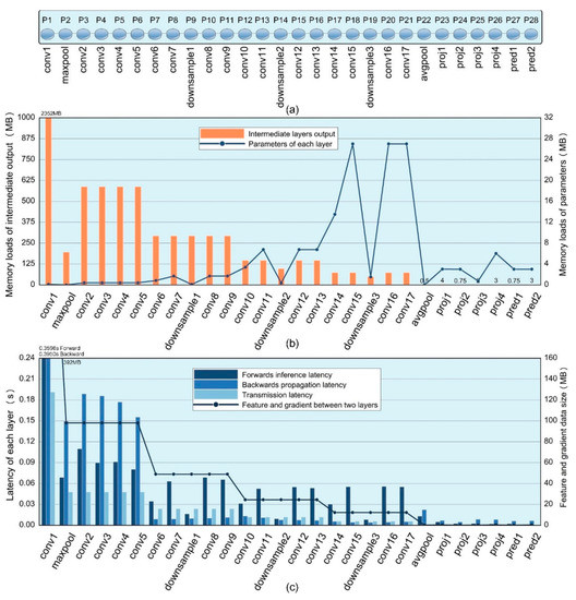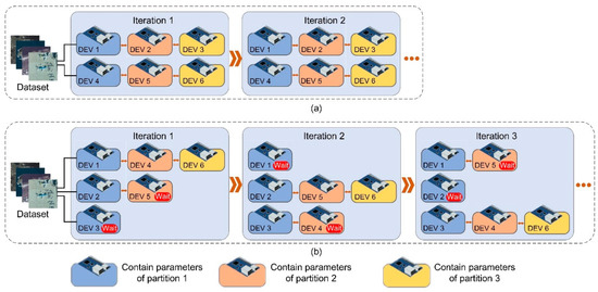 In Figure 3b, the feature and gradient are transferred between devices. Take Device 1 and Device 2, for example; Device 1 is in charge of Partition 1’ s training and Device 2 is in charge of Partition 2’ s training. In iteration t, during forward propagation, the last layer of Partition 1 in Device 1 transmits feature value to the first layer of Partition 2 in Device 2. During backward propagation, Device 2 transmits the gradient value to Device 1, the gradient of Partition 1′s last layer is , where is the weight parameter of Partition 1′s last layer obtained from iteration t − 1. Device 1 updates the weight parameters according to Equations (6) and (7): ,where is learning rate.