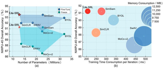 - Extensive experiments on four representative datasets demonstrated that Lite-SRL could improve the scene classification accuracy under limited annotated data, and it is generalizable to SAR and optical images. Compared with six state-of-the-art methods, Lite-SRL had clear advantages in overall accuracy, number of parameters, memory consumption, and training latency;
