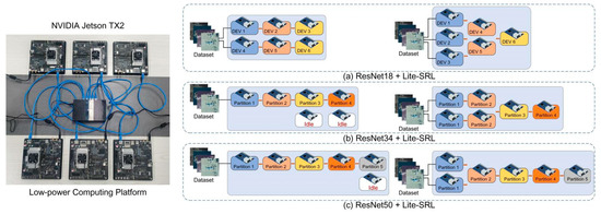 Under model parallelism, each node has different parameters and is responsible for the computation of different model layers respectively, updating only the weights of the assigned model layers. Setting appropriate network partitioning points for network partitioning can improve the efficiency of distributed training. TX2 uses Jetson series SOC, with CPU and GPU sharing 8 GB memory and the memory requirements during Lite-SRL training process are larger than the computing capacity of a single TX2; thus, network partitioning and workload balancing are required.