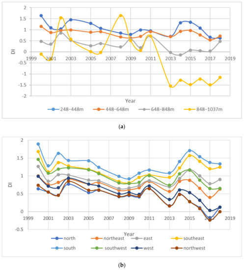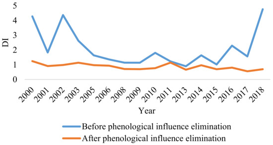 As shown in Figure 2, DI eliminated the influence of phenology. By comparing the DI values of prior to and after eliminating phenological influence, we clearly found that the data curve was more stable after the phenology was eliminated. When there was no elimination of phenology, there was a clear upward trend in 2002, 2010, 2014, 2016, and 2018.
