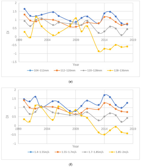 The mean values of DI under different grade factors were calculated, and the results are shown in Figure 3. Through the analysis, it was found that six topographic and meteorological factors affected DI, but the results were different. Among them, as the elevation increased, the DI showed a downward trend; the slope went from south to north and east to west. During the process, the DI showed a downward trend, indicating that the vegetation recovery became better; as the slope increased, the DI showed a downward trend and then an upward trend, indicating that the vegetation recovery was the best on a certain slope, and being above or below this slope would adversely affect the vegetation-restoration impact. As the temperature rose, the DI showed an upward trend; as the precipitation increased, the DI showed a downward trend; and as the wind speed increased, the DI showed a downward trend.