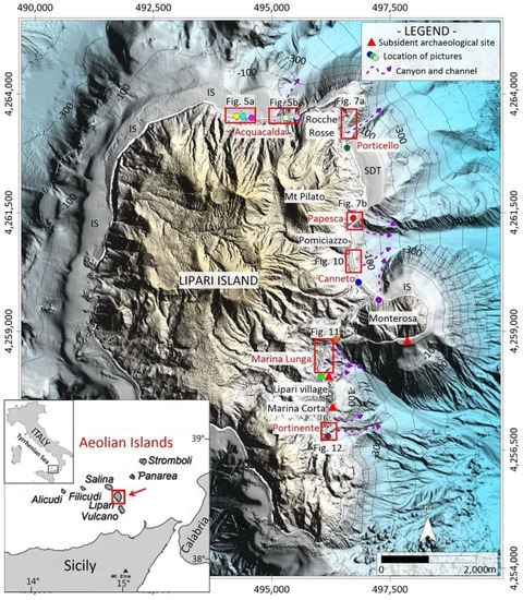 - Romagnoli, C. L’approdo di Marina Corta: Un porto che scompare. In Guida ai Vulcani e Alla Natura Delle Isole Eolie; Calanchi, N., Lo Cascio, P., Lucchi, F., Rossi, P.L., Tranne, C.A., Eds.; Comune di Lipari: Regione Sicilia, Italy, 2007; pp. 98–102. [Google Scholar]