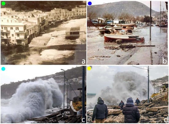 The information regarding the wind conditions in the central Aeolian Islands in the last decades of the 20th century is reported by Cicala []. In the Aeolian Archipelago, winds coming from the NW and W are predominant; therefore, the most energetic wave approach is from the westerly directions. Storms from the Tyrrhenian Sea, in fact, struck the western coastlines of the islands with a fetch of c. 300 nautical miles. At Lipari, storms due to winds from the NW and W were recorded for 34% and 26% of the time, respectively, in the time frame of 1976–95; however, the related effects of wave erosion along the NW coastline are partly reduced by the shadow effect of the nearby Salina Island (Figure 1, inset). Storms from the SE (due to the Scirocco wind, about 11% of the time, []) and E (Levante and Grecale, 3% and 4% of the time, respectively) affect, in turn, the south-eastern and eastern coasts of Lipari, causing severe flooding and damages (Figure 2a,b) as most of the low-lying coasts are located on this side of the island and are exposed to this wave’s provenance. Storms from the N are less common (6% of the time according to []), but they can occasionally impact the northern Lipari coast with high energy (Figure 2c,d). Updated and more complete measurements on the wind and wave regime are not available, and this prevents any possible quantitative link between these processes and the observed coastal evolution.