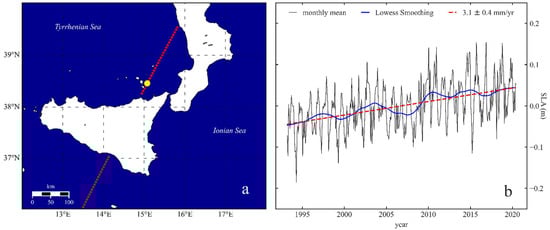 We selected the three closest points to Lipari along the track 059 (enclosed within the yellow point in Figure 3a), located, respectively, ca. 4.5, 8.5, and 11 km away from the island’s eastern coast. The series were first stacked, and then, a monthly averaging was computed from the near 10-day sampling data in order to obtain an SLA time series (Figure 3b), representative of the local variability for the time span of March 1993–May 2020. To compute the linear trend over the considered period, the monthly series was first corrected for glacial isostatic adjustment (GIA) [], and then the mean seasonal cycle was subtracted from the mean sea level; thus, the data autocorrelation in time was taken into account, following Zervas [], in order to achieve a proper estimate of the trend and related error (3.1 ± 0.4 mm/yr; red dashed line in Figure 3b). Furthermore, in order to appreciate the non-linear variability in SLA, a low-pass filtered curve (Lowess smoothing) is plotted in Figure 3b (blue line).