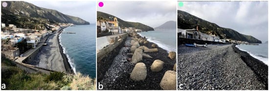 Panoramic view of the Acquacalda bay (a) and zoom of the central (b) and the western side (c). Location of pictures is in Figure 1 through respective colored dots.