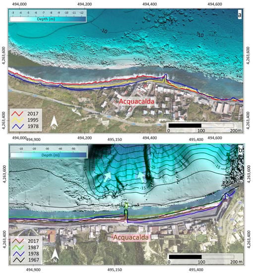 Map of Acquacalda sector, with zoomed areas in the western (a) and eastern (b) part of the beach and selected shorelines. See Figure 1 for location of both maps. White arrows show the active canyon heads located in the nearshore.