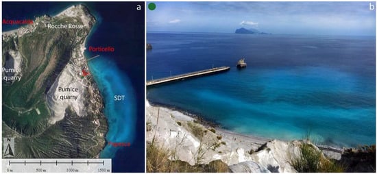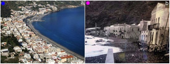The bay of Marina Lunga (also known as “Marina di Portosalvo”), located to the south of the Monterosa promontory (Figure 1), is the seat of most of the residential, commercial, and touristic settlements of Lipari. It evolved from a pebble beach to a port structured with docks and piers at the end of 1800 [], and nowadays, its southern sector is the seat of the main landing pier for touristic ships and ferries (Figure 11a).