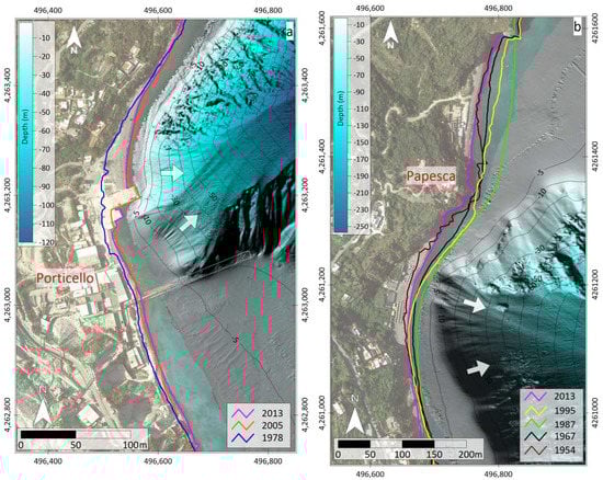 Zoomed maps of Porticello (a) and Papesca (b) sectors and selected shorelines. The white dotted line in (a)represents the location of the boarding jetty built in front of the pumice exploitation plant; white arrows show the active canyon heads located in the nearshore. See Figure 1 for location of both maps.