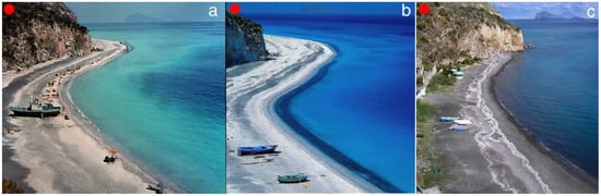 Images of Papesca beach from the end of 1970s to the beginning of the 1980s (a,b), showing the large extension of the beach at that time, due to abundant supply of pumice fragments moved by the littoral drift. Today (c), the same beach appears severely retreated (compare images with respect to the cliff in the background) and pumice fragments are locally accumulated only as narrow white stripes on the beach ridges. Location of pictures is in Figure 1 through the respective red-colored dot.
