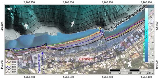 Map of the northern Canneto sector and selected shorelines. White arrows show the active canyon heads located in the nearshore. Location in Figure 1.