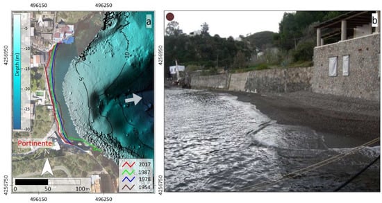 A very narrow beach is present only in the mid-southern part of the bay, where it is backed by a street and the village. The beach is gravelly–sandy and is made of volcaniclastic materials (fragments of lava, scoriae, etc.), reflecting the lithology of the hydrographic basins (lavas and pyroclasts; []). The pumice fraction is rare, as observed for all the beaches to the south of Monterosa. The coastline of 1954 appears still quite regular and continuous, and at that time, the beach reached a maximum extension of 30 m (Figure 11a). In the following decades, however, the beach has mostly retreated (Figure 11a and Figure A6). A set of groynes (Figure 11b) was installed at the end of the 1960s and in the early 1970s to protect the beach from erosion, and this has obviously affected the coastline evolution here as it has assumed an embayed shape in between the groynes (Figure 11a,b). Apart from a local inversion of the trend, with partial recovery in the southernmost part of the beach, where the main pier was prolonged, the beach never recovered its original extension and a slight negative rate of shoreline displacement (i.e., retreat) prevails in the overall period of 1954–2017 (Figure A6). The present-day beach in this sector is only several meters wide and is backed by a wall that separates it from the road plan (Figure 11). It is worth noting that the articulated head of the Marina Lunga canyon system deeply carves the bay into different branches (Figure 1 and Figure 11a), reaching the coastal area up to a very shallow depth (4 m wd), especially in the middle and southern part of the bay, undermining the coastal structures located here.