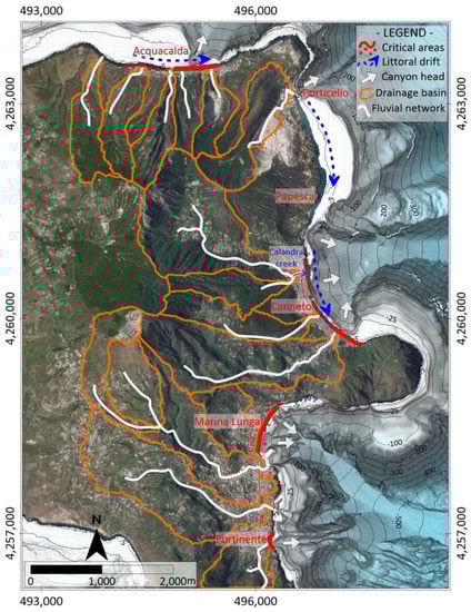 Sketch of drainage basins and fluvial network in the eastern and north-eastern sectors of Lipari Island. Main coastal areas critical for coastal erosion and flooding are indicated with red lines (dashed red line indicates sectors that are “potentially critical”; they are maintained in a precarious equilibrium state by man-made activities, such as defense interventions). The location of the active canyon heads located in the nearshore and the direction of the main littoral drift are also indicated.