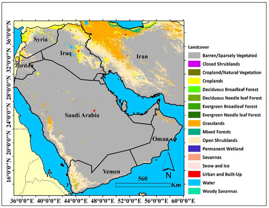 For more investigation, Figure 3 shows dust hotspots which were computed based on daily AOD data from 2000 to 2019. Eight major dust hotspots (yellow to red indicate the most frequent days with AOD > 0.6) in Syria, Iraq, Iran, Saudi Arabia, and Yemen−Oman. These dust hotspots are distributed in different conditions of both climate regime and socio-economic status related to impacts on desertification such as war, dam building, and farming management. The eight hot spots are analyzed separately in this study. As shown in Figure 4, these areas are associated with the barren/sparsely vegetated land-type class.