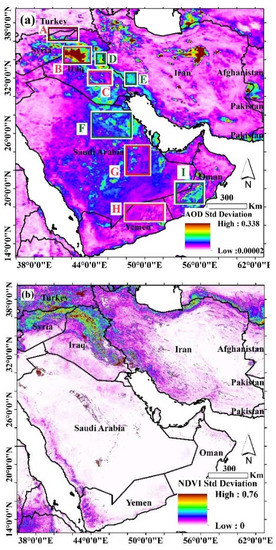 Standard deviation maps for AOD show spatial trends in relative dust intensity in the study area (Figure 2a), with higher values in the standard deviation map showing areas more vulnerable to dust storms. Enhanced values were observed for an extensive area extending from the western part of Syria to the southwest of Iran (Khuzestan), and south of Saudi Arabia, northwest Iran, and the center of Iran. The highest standard deviations in the NDVI map (Figure 2b) extend from western Syria to southwestern Iran. A key detail is that these areas of tremendous variability in NDVI do not overlap much with regions in the AOD map with the highest variability. Over large swaths of Saudi Arabia, including the south and eastern areas, close changes in vegetation cover were negligible despite the high annual variability of dust intensity. According to Figure 2a,b, there are different relationships between NDVI and AOD. Consequently, we now compare different sub-regions exhibiting differing relationships between AOD and NDVI.